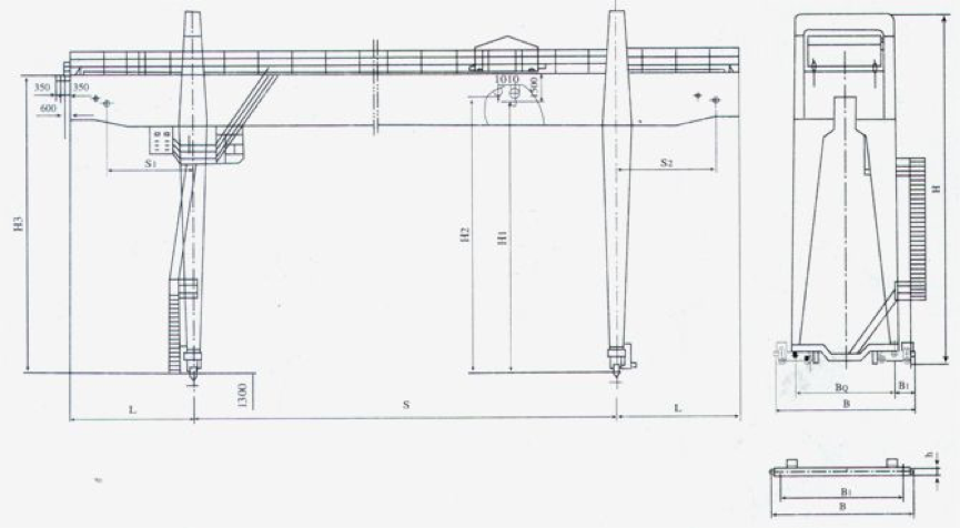 起重機(jī)有橋架、大車運(yùn)行機(jī)構(gòu)、小車、電器設(shè)備等組成。橋架采用箱型雙梁焊接結(jié)構(gòu),大車運(yùn)行機(jī)構(gòu)采用分別驅(qū)動(dòng),全部機(jī)構(gòu)均在操縱室操縱,起重機(jī)導(dǎo)電形式分為電纜和滑線兩種,用戶可任選一種,圖表中數(shù)據(jù)以滑線為準(zhǔn)。