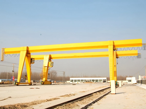 雙梁龍門(mén)吊:主梁為兩根平行的箱型梁(或桁架梁),起升機(jī)構(gòu)(卷?yè)P(yáng)機(jī) + 小車(chē))安裝在兩根主梁之間的橫梁上。20 噸荷載由兩根主梁共同分擔(dān),受力均勻且分散,主梁變形風(fēng)險(xiǎn)遠(yuǎn)低于單梁;同時(shí),雙梁的小車(chē)軌道鋪設(shè)在主梁頂部,受力更穩(wěn)定,車(chē)輪與軌道的磨損更小,“啃軌、卡頓” 這類(lèi)高頻故障的發(fā)生率顯著降低。?